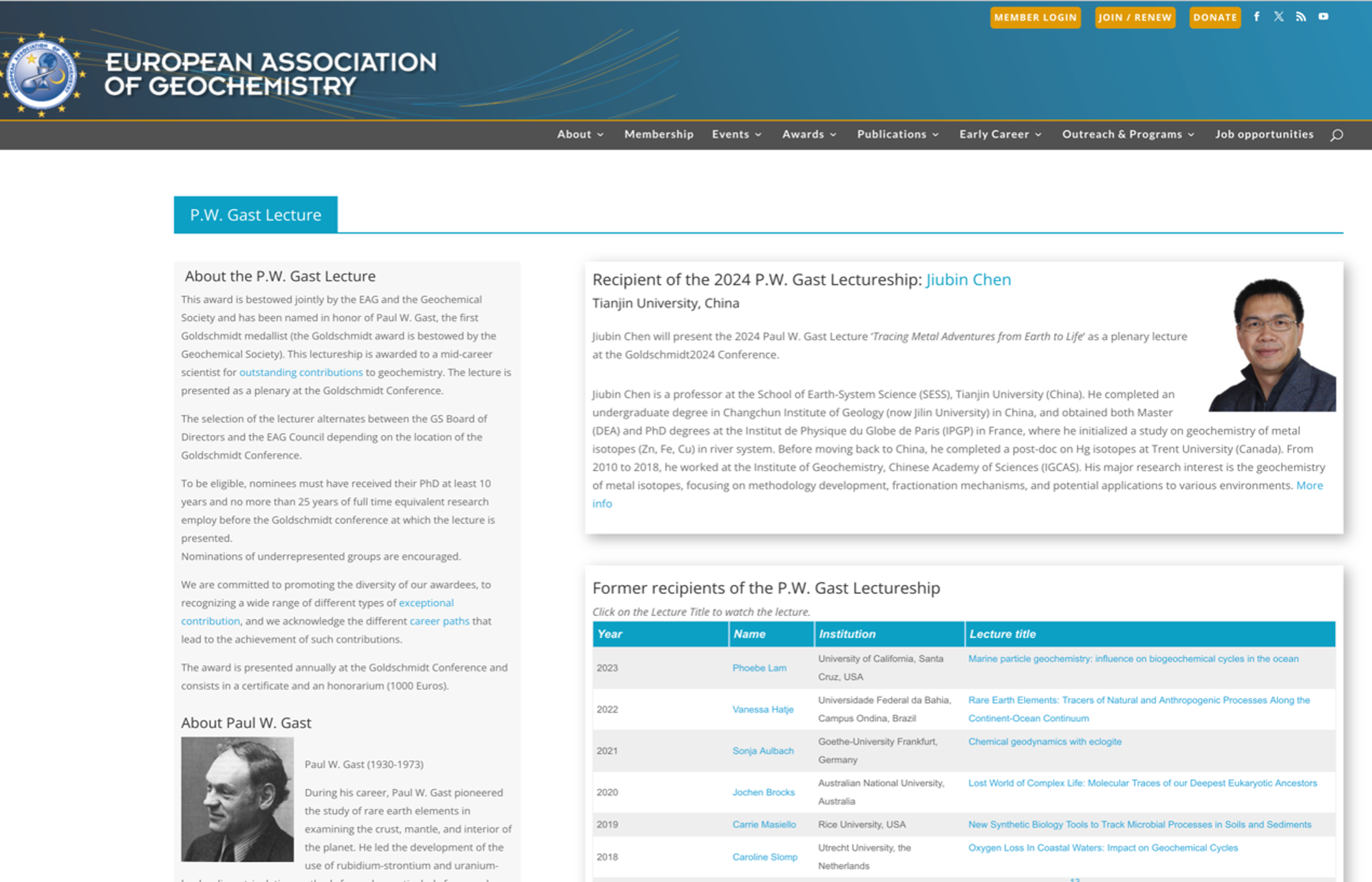 近日,国际地球化学学会(Geochemical Society,GS)和欧洲地球化学学会(European Association of Geochemistry, EAG)正式授予天津大学地球系统科学学院陈玖斌教授2024年Paul W. Gast Lecture奖。该奖是由GS和EAG共同设立,以美国著名学者Paul Werner Gast的名字命名,旨在奖励职业生涯中已在地球化学领域做出突出贡献的科学家,每年授予一位。自1979年设立以来,共28位来自全球的著名科学家获奖,陈玖斌教授是获此荣誉的首位中国学者。获奖人陈玖斌教授将应邀在2024年Goldschmidt国际地球化学年会上做大会报告,并领取奖项证书。