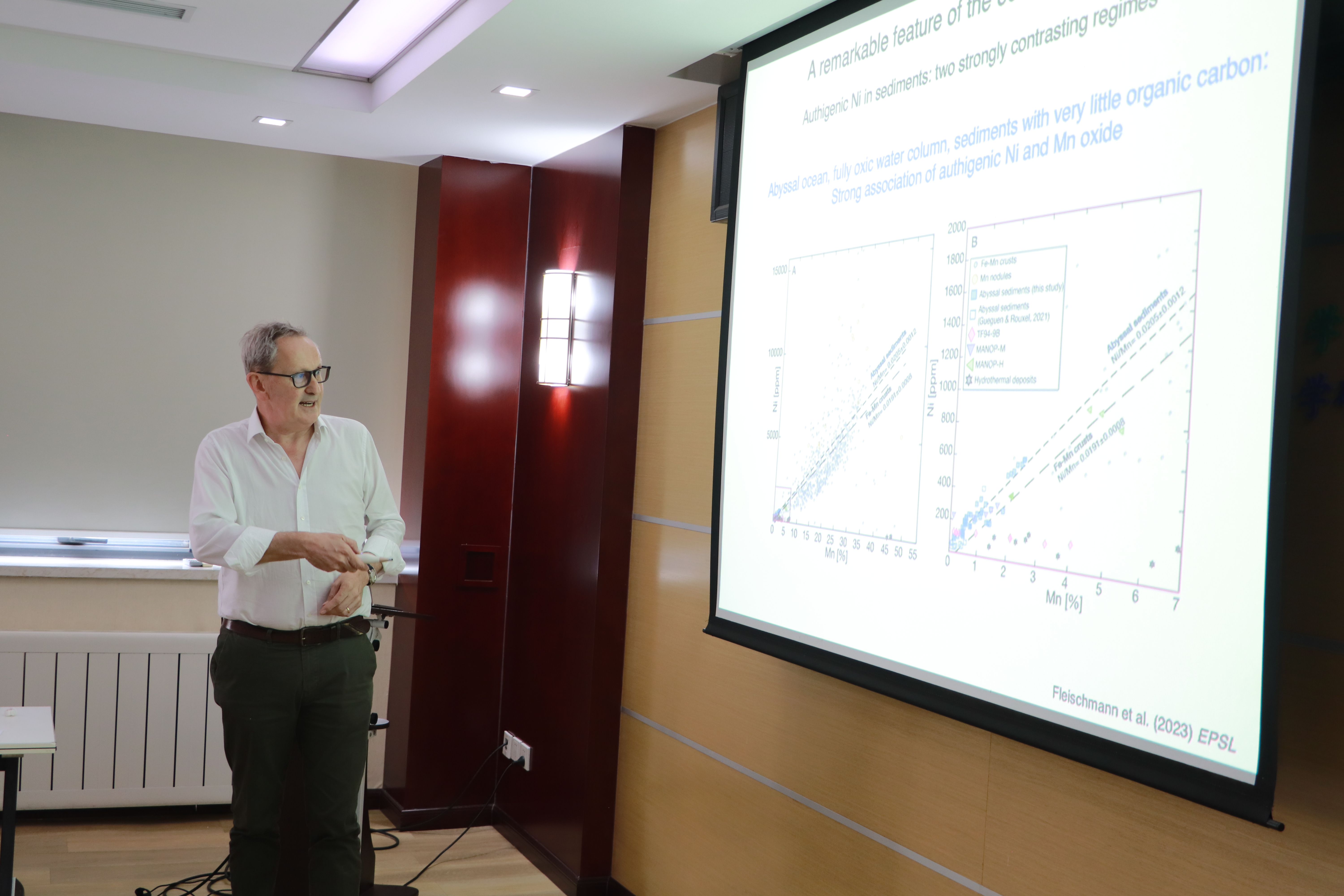 Vance教授在报告中指出,海洋微量金属及其同位素系统的生物地球化学循环通常被认为是由“自上而下”的过程主导。然而,最新的GEOTRACES数据等表明,“自下而上”的过程更为重要。他解释道,虽然生物吸收和再矿化过程及可逆清扫过程是控制海洋元素循环的重要因素,但生物颗粒并非微量金属的重要清除剂。相反,锰氧化物才是主要的清除剂,它们不会在氧化深海中重新溶解,而是通过沉积物-水界面的通量维持高深海浓度。这一新框架对现代海洋金属循环以及对过去海洋沉积记录的解释具有重要意义。报告后,Vance教授与参会师生围绕海洋微量元素行为展开深入讨论。