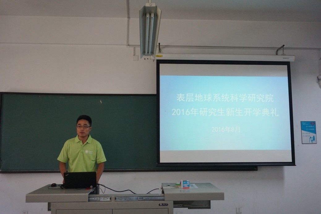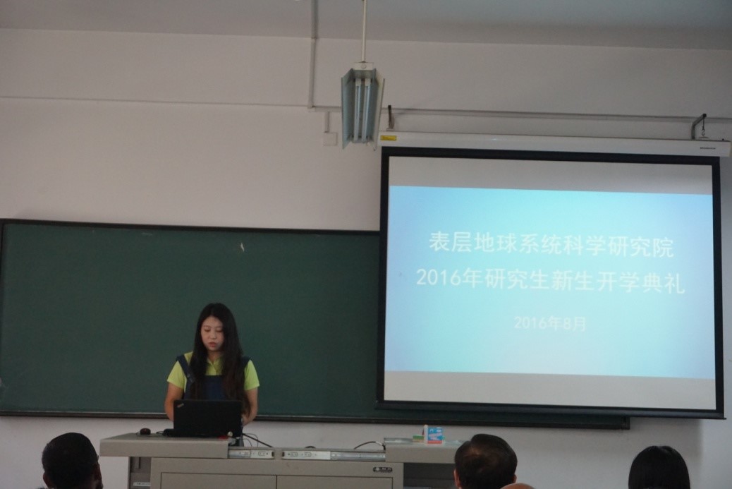 典礼由地科院办公室主任赵剑博老师主持。2015级硕士夏妍梦和2015级博士生新生贾国栋分别代表老生和新生发言。夏妍梦代表15级研究生欢迎新生到来。她分享了自己过去一年在地科院学习科研的感受,结合实际给师弟师妹们提出了很多宝贵的建议。