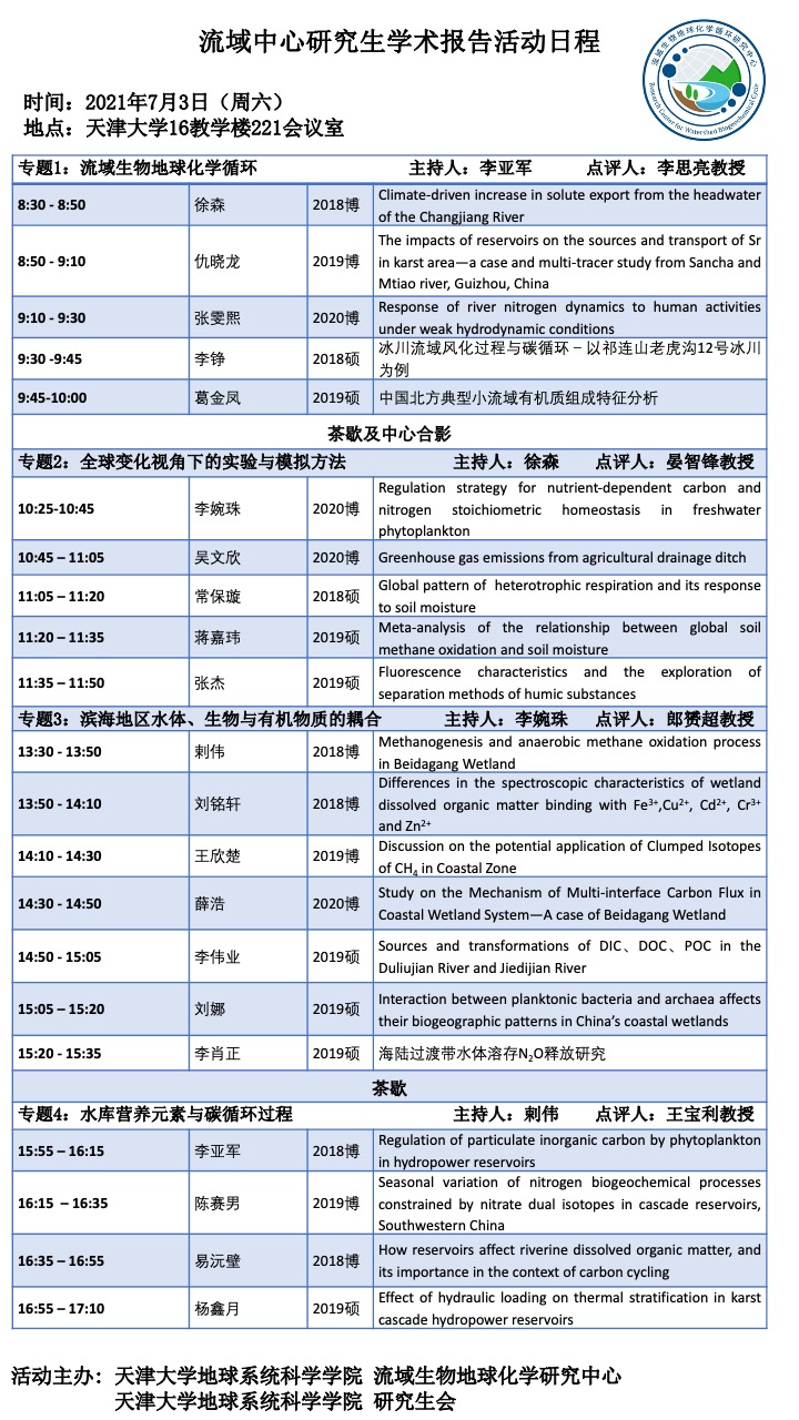 为促进流域生物地球化学循环研究中心(流域中心)各课题组的相互交流,7月2日,流域中心在221会议室举办研究生学术报告会。此次学术报告会由李思亮教授、郎赟超教授、王宝利教授、晏智锋教授共同主持,流域中心师生参加,21名高年级博士/硕士生进行报告。