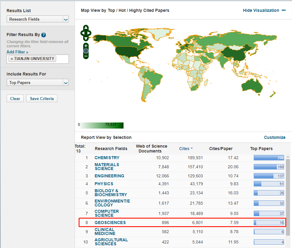 本次全球共计823所研究机构进入地球科学领域排名,天津大学论文合计被引用6801次,在该领域排名第784位;过去十年,天津大学在该领域发表发表高水平论文896篇,列世界的第440位;高被引论文16篇,并列世界第452位。