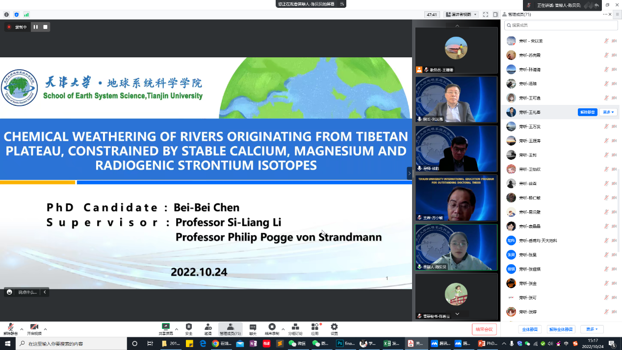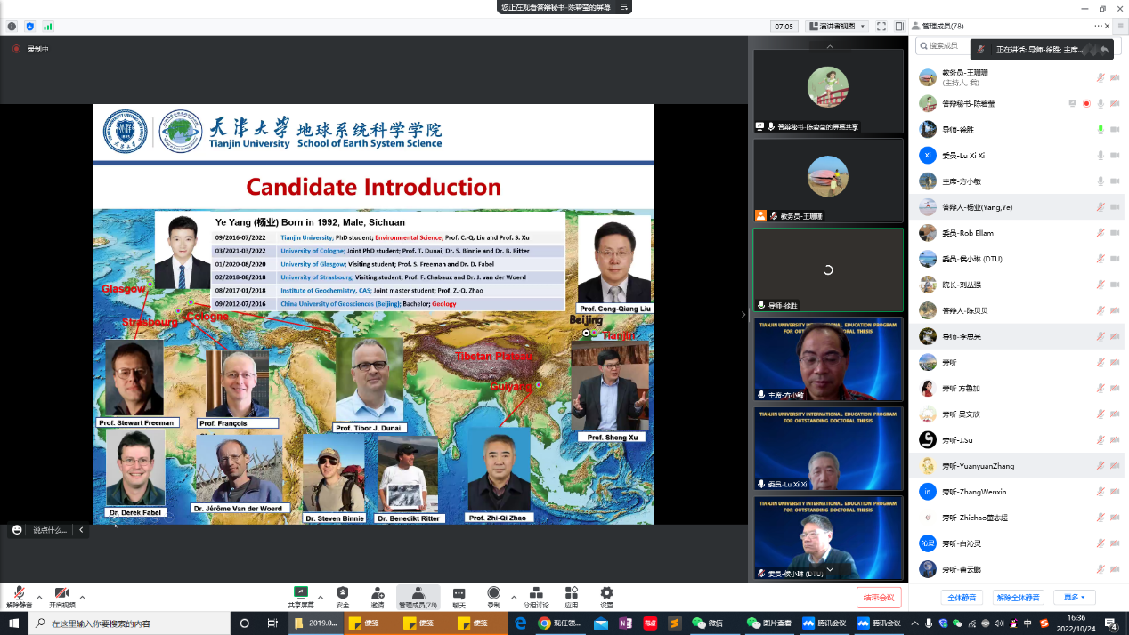 2022年10月24日,天津大学地球系统科学学院(以下简称“地科院”)在线举办首届博士学位论文答辩国际评审会(以下简称“国际评审会”)。博士生陈贝贝和杨业以全票通过的成绩顺利完成博士学位论文国际答辩。本次国际评审会主席由中国科学院青藏高原研究所方小敏研究员担任,委员包括英国格拉斯哥大学Rob Ellam教授、新加坡国立大学Xixi Lǚ教授、丹麦技术大学Xiaolin Hou教授和中国科学院地理科学与资源研究所郭庆军研究员等环境及地理科学领域的国内外知名专家学者。地科院院长刘丛强院士、学生导师及70余位师生在线参会。
