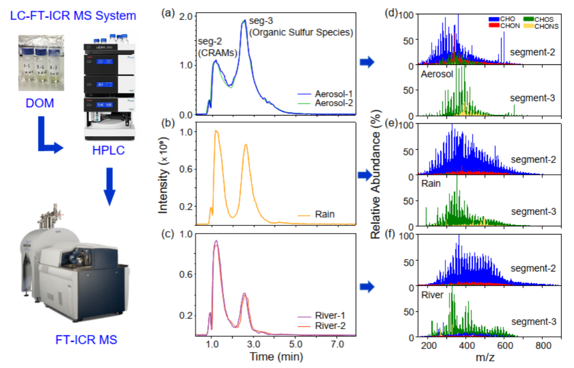 近日,我院傅平青教授团队利用改进的液相色谱-傅立叶变换离子回旋共振质谱(LC-FT-ICR MS)联用技术,对上海河口区域的气溶胶、雨水和河水样品中的DOS分子进行探究(图1),相关成果以“Elucidating Dissolved Organic Sulfur in the Coastal Environment by Improved Online Liquid Chromatography Coupled to FT-ICR Mass Spectrometry”为题,发表于AGU旗下期刊《Journal of Geophysical Research: Oceans》。