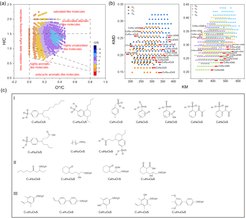 图2 (a)水-气介质共有含硫化合物;(b)人为源CHOS同系物;(c)人为源CHOS可能结构式