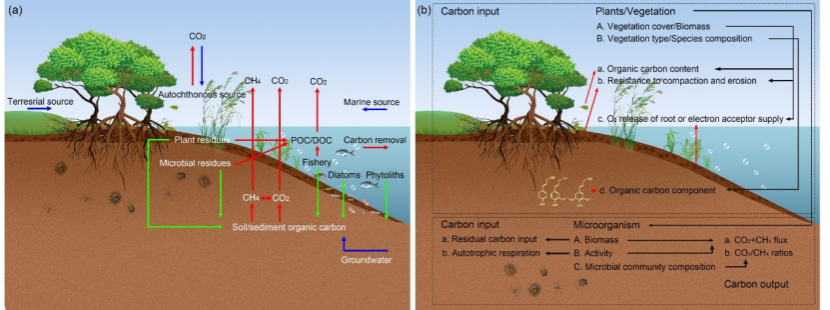 图1.(a)滨海湿地生态系统碳过程,包括碳输入、输出和沉积等;(b)植物和微生物对滨海湿地中碳固存的影响。