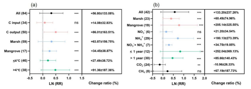 图2.(a)气候变暖对滨海湿地碳过程的影响;(b)氮添加对滨海湿地碳过程的影响。“***”表示p < 0.001,“**”表示p < 0.01。