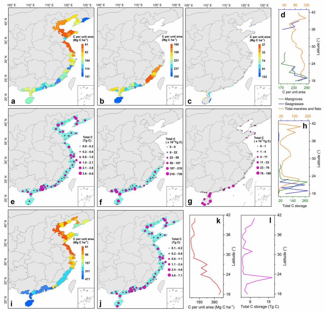 (k)- (i)沿海县/市蓝碳生态系统碳密度与总碳储量纬度分布特征