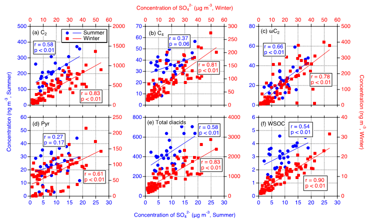 二元酸及其相关化合物是有机气溶胶(OA)的重要组成部分,能够为OA的来源提供证据。我院Chandra Mouli Pavuluri教授课题组研究了天津市夏、冬两季大气细颗粒物(PM2.5),以期更好的了解华北地区OA的来源和二次生成机制。据观测结果发现,煤炭和生物质的燃烧、区域尺度的原位光化学反应以及远距离传输的老化气溶胶是夏、冬两季水溶性OA的主要来源。 本研究表明,液相环境下二元酸及其相关化合物随着SO42-的增加而增加,这意味着需要控制氧化剂(NOx 和SO2)的排放来减少华北地区水溶性OA负载量。