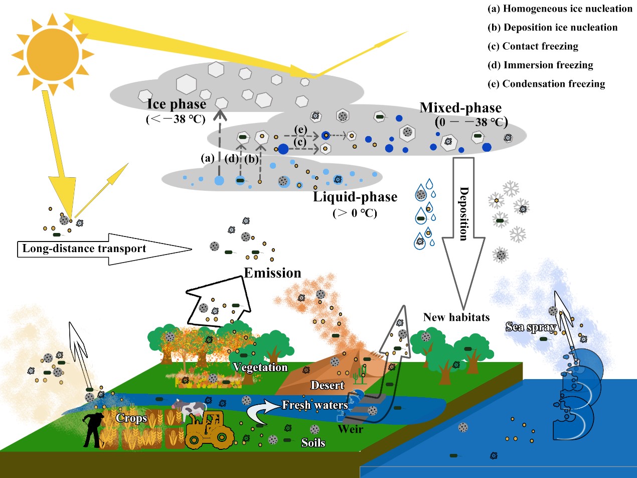 大气中生物性冰核颗粒物的来源、传输及冰核化过程示意图