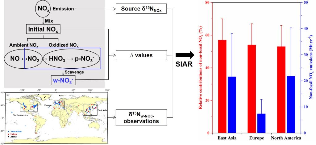工业革命以来,人类活动导致陆地大气系统的活性氮快速持续增加,现已成为最突出的全球性环境问题之一。其中,以燃煤和机动车尾气为主的化石源氮氧化物(NOx)排放被认为是大气硝态氮(NOy)污染和沉降通量增加的主要原因。但是,由于地表微生物氮循环和生物质燃烧等产生的非化石源NOx的排放强度及其对大气NOx的贡献难以约束,导致陆地大气化石和非化石源NOx的相对贡献尚不确定,总NOx排放量不清楚,这影响大气NOx减排策略的制定、沉降量清算和模拟,以及氮沉降生态效应的评估。