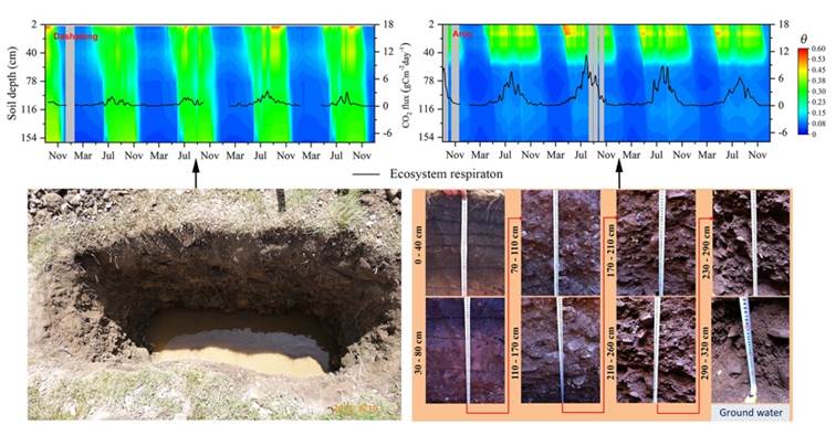 研究中通过对比青藏高原东北部黑河上游地区高寒沼泽草甸和高寒草甸生态系统呼吸及其与多层土壤温度和湿度数据证明相比高寒草甸/草地,高寒沼泽草甸更高的碳汇主要由生长季浅层地下水对土壤呼吸的抑制作用导致(图1)。该研究证实升温不仅通过加速冻土分解影响高寒地区土壤碳动态,而且会通过改变土壤水文条件影响土壤呼吸CO2排放。