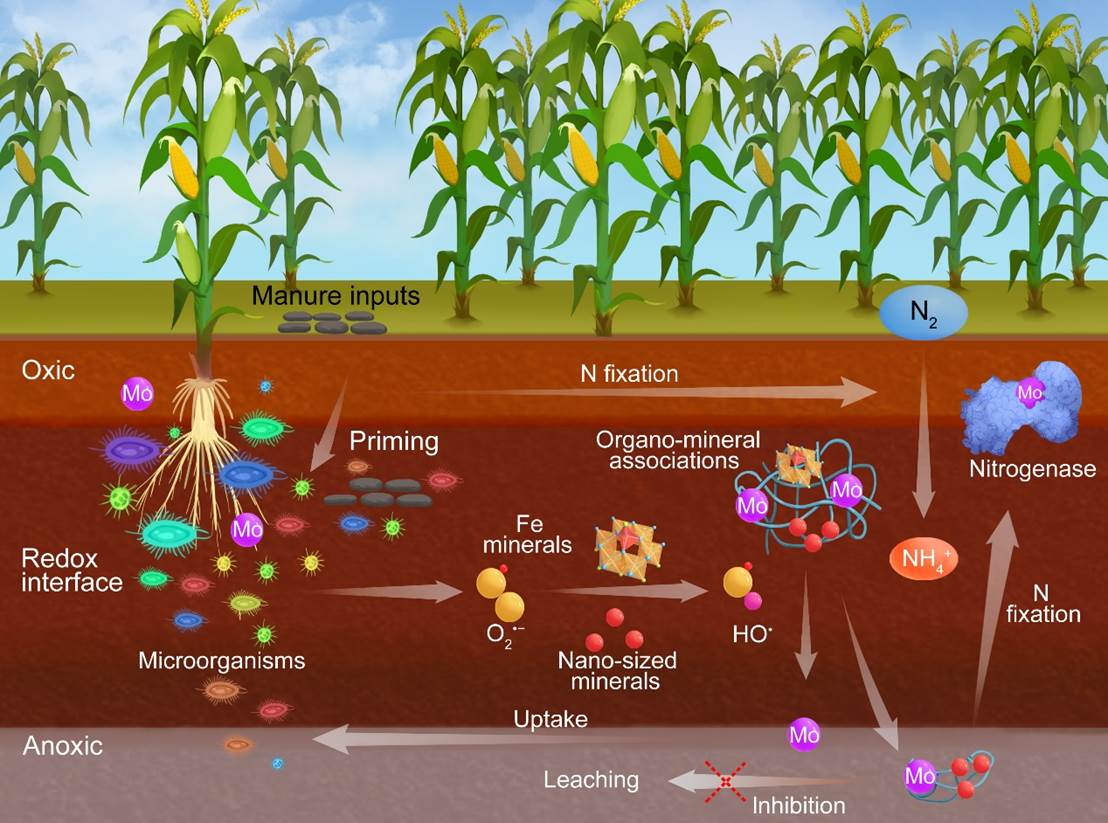 天津大学地科院界面过程与土壤圈演化研究中心余光辉教授、孙富生博士等与德国哥廷根大学Yakov Kuzyakov教授、图宾根大学Andreas Kappler教授、浙江大学罗煜副教授、广西大学Bernard A. Goodman教授和南京农业大学硕士生刘飞飞等合作,利用湖南祁阳长期(26年)定位试验站和同位素示踪试验,结合纳米离子探针(NanoSIMS)、同步辐射谱学显微成像和高通量定量PCR等现代分析手段,发现长期施用有机肥(猪粪)显著增加了土壤中生物多样性和短程有序(SRO)矿物含量,进而提升了土壤中总钼(~30%)、有效态钼(~2.8倍)、固氮基因nifH丰度和固氮酶活性。铁矿物纳米颗粒在土壤钼循环过程中起到双重作用:1)协同土壤微生物群落,驱动了土壤中原位芬顿或类芬顿反应以及高活性羟基自由基(HO•)的产生,导致土壤中有效态钼提升;2)促进了土壤中铁矿物纳米颗粒的形成,进而增加了土壤钼的截留。结合同位素示踪和高通量定量PCR技术,识别了驱动铁矿物产生高活性羟基自由基的功能微生物群落。其中,共生短杆菌属(Symbiobacterium)、地杆菌属(Geobacter)、红环菌属(Rhodocyclaceae)、固氮螺菌属(Azospirillum)在驱动二价铁和高活性羟基自由基形成方面起到关键作用。