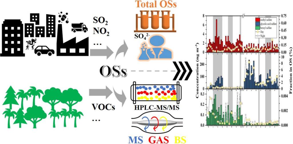 OSs是挥发性有机化合物对硫酸盐气溶胶的反应性吸收的产物,是一种重要的人为影响下生物源二次有机气溶胶生成的示踪剂。对OSs的定性及定量分析不仅可以为二次气溶胶含量的模型模拟提供数据支撑,还可以帮助分析潜在的大气物理和大气化学过程并理解人类活动对生物成因二次有机气溶胶形成的影响。受限于检测方法,OSs检测方法不完善,大多数OSs没有被检测到,且大多数OSs没有商业上可获得的标品。因此,研究将OSs总量分析与典型OSs进行结合,对OSs时空分布特征和形成机制进行深入的分析。