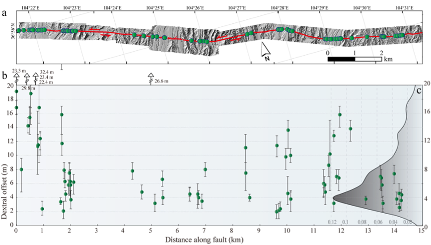 同时,本研究对高精度地形数据的错断地貌信息进行了充分挖掘,利用最新的基于MATLAB软件开发的半自动测量代码(LaDiCaoz_v2)系统获取了沿断裂共73个点位的左旋位移量和垂直位移量,结果显示紫红山断裂上平均同震位移量可能达到3.9 m。结果均与其北侧的1920年Mw 7.9海原强震破裂带上的最新相关研究结果的量级相近。此外,基于震级-长度-平均位移的多个经验关系式,估算了紫红山断裂如果全段产生地表破裂所产生的震级可能为Mw ~7.0级。基于该项研究,刘静教授团队指出紫红山断裂的地震危险性被明显低估,而其邻近著名的黄河石林国家地质公园,应当被予以重视并开展更细致的古地震研究工作。