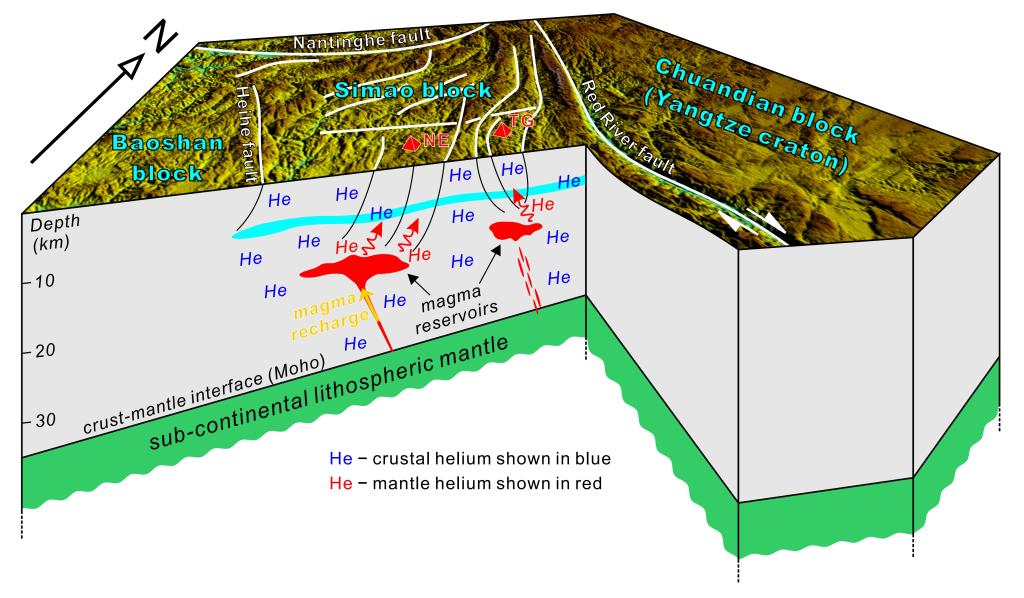 2 思茅地块火山与构造活动导致的深源He释放模式图