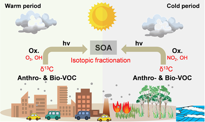研究发现:(1)天津市OA受生物质和化石燃料燃烧混合排放源的贡献;(2)在暖期(3月-9月),由于OA发生强烈的光化学老化,13C在草酸中富集,且长链二元酸的光化学降解以及α-二羰基化合物的光化学转化是生成草酸的主要途径;(3)在冷期(10月-2月),尽管OA发生液相老化过程,但13C在二元酸中损耗,α-二羰基化合物的液相氧化应该是生成草酸的主要路径。