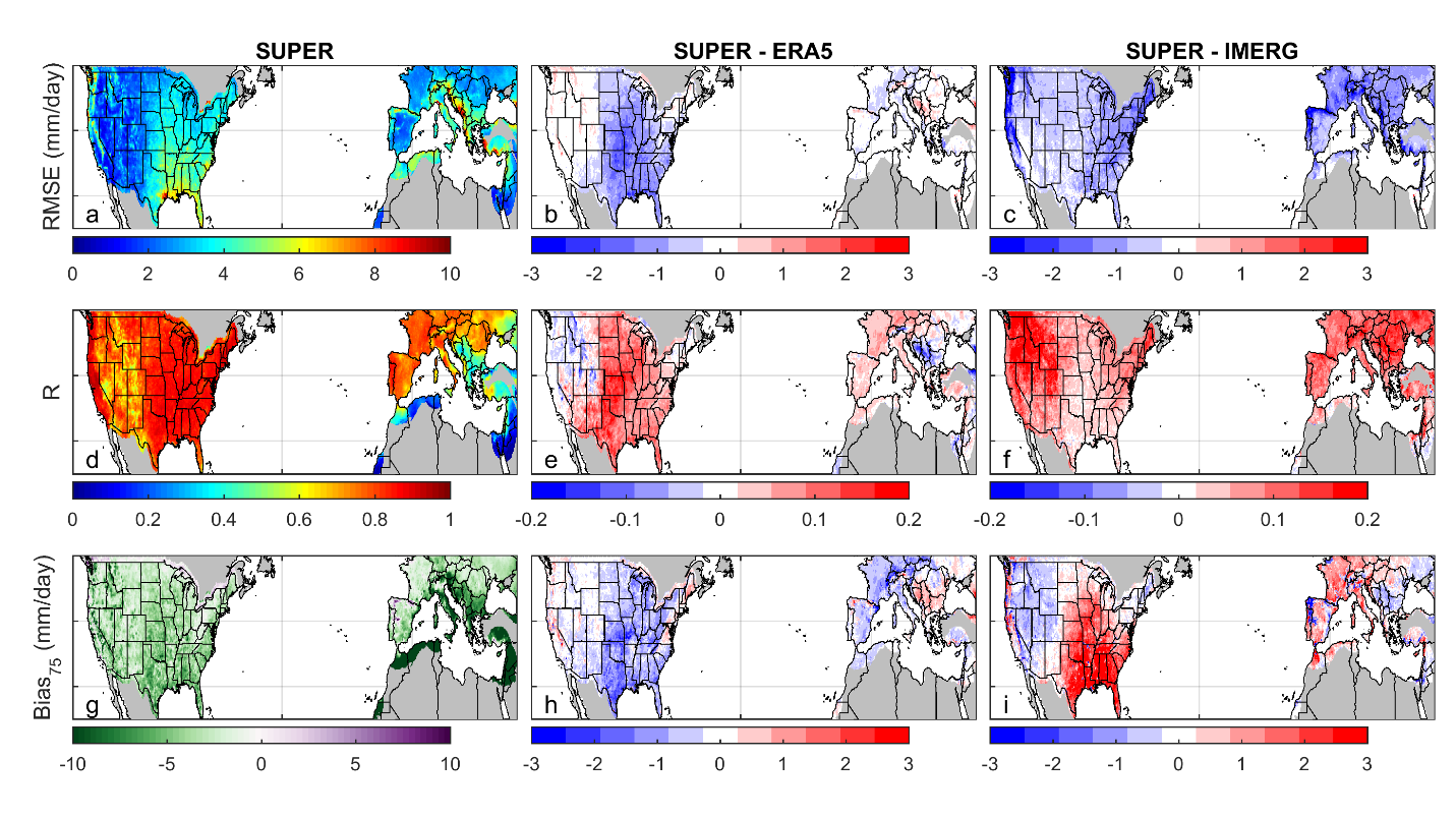 图1 SUPER的降水数据融精度评估,及其与ERA5和IMERG降水数据集比较
