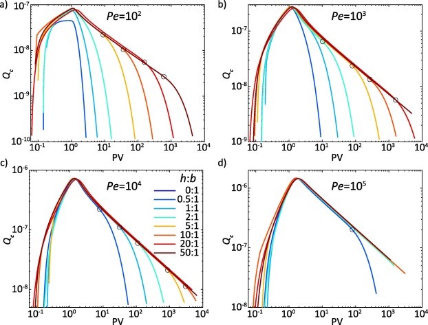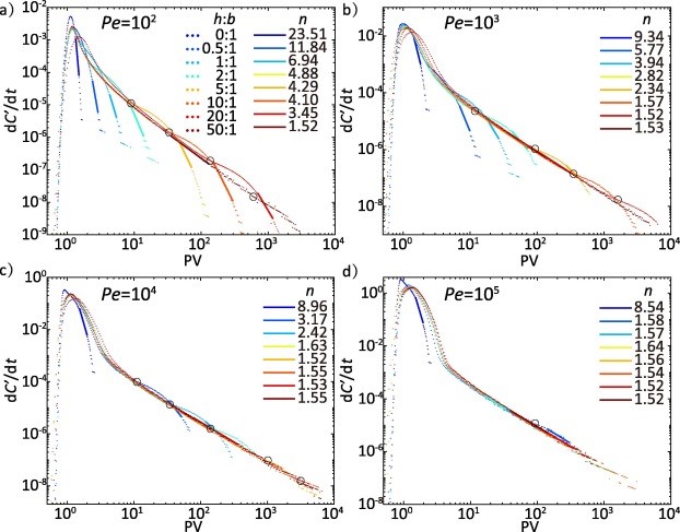 图3 不同Peclet数(Pe)裂隙-基质系统出口处时间滞留分布曲线:a) Pe = 102, b) Pe = 103, c) Pe = 104, 和 d) Pe = 105