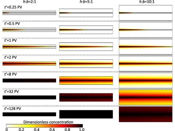 (1)n随h和Pe的增加而减小,当h和Pe较大时,n趋向于理论解1.5,其它情况下n都会偏离并大于理论解析解(图4)。基于80多种案例结果,该研究建立n和(h:b,Pe)的经验公式,试图解释和预测n在现实条件下的可能取值,同时可以通过n反推基质宽度与传输状态;