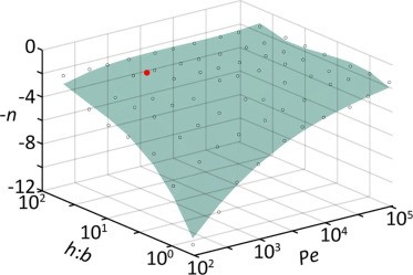图4 幂指数(n)与基质宽度(h:b)和Peclet(Pe)数的关系