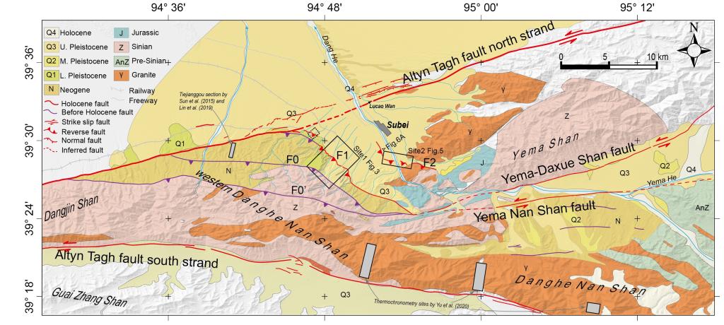 党河南山北缘逆冲断裂是青藏高原东北缘祁连山地球一条重要的断裂带,它西端与阿尔金断裂大型走滑断裂带相接,并构成了走滑-逆冲转换体系,控制祁连山地壳缩短和山脉隆升。同时,党河南山北麓建有甘肃省肃北蒙古自治县县城,敦格铁路线在此多次穿过党河南山北缘断裂和阿尔金断裂,因此评估该区域地震危险性具有重要的理论和实用意义。基于此,天津大学地科院刘静教授团队与合作者对党河南山北缘断裂的三维几何结构和滑动速率进行了重新厘定。
