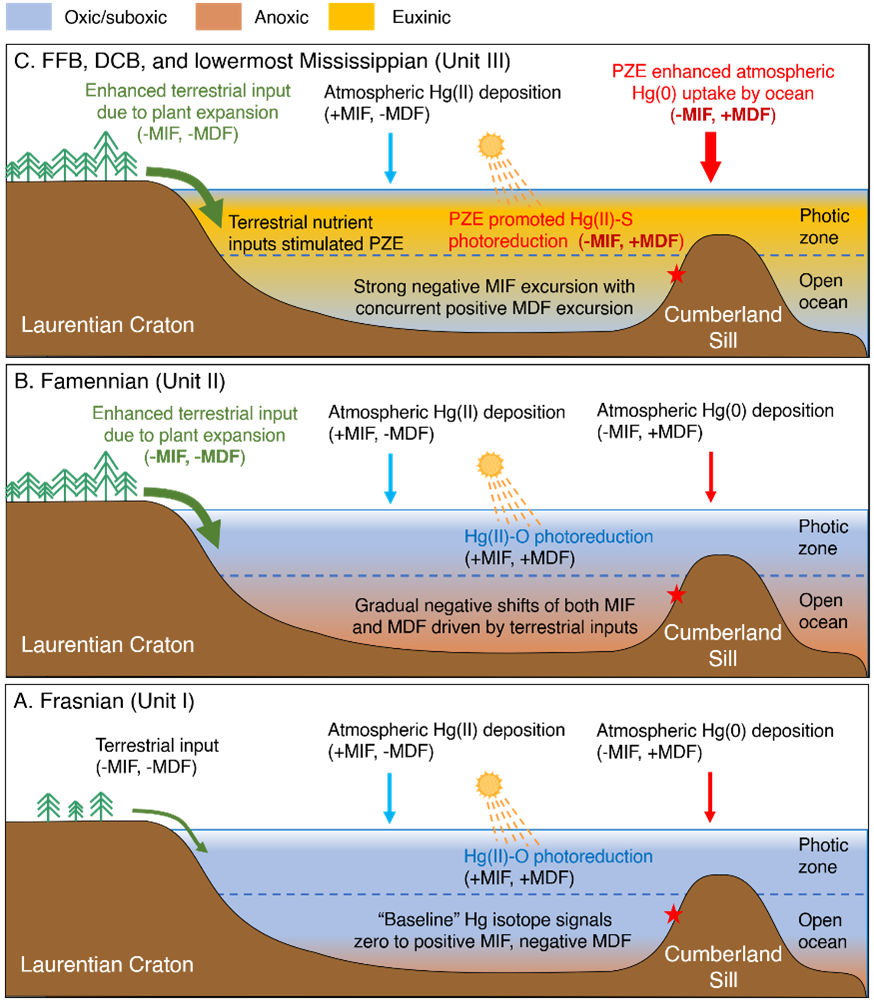 上述基于汞同位素的发现揭示了晚泥盆纪主要环境变化事件(火山活动、陆地植被扩张、海洋透光带)之间的关系(2),并为海洋透光带硫化对晚泥盆纪生物大灭绝的影响提供了新的证据,也进一步表明汞同位素在重建古环境演化方面具有巨大的应用潜力。