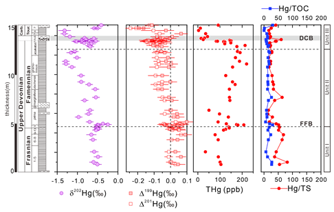 近期,天大地科院同位素前沿科学中心与美国乔治梅森大学合作,利用汞同位素重建了晚泥盆纪的海洋透光带硫化事件,并评估了其对晚泥盆纪生物大灭绝的影响。晚泥盆纪生物大灭绝的机制是显生宙五大灭绝事件中的一个难题,现有的研究普遍认为与大型火山活动和海洋缺氧/硫化有关。本研究测定了北美Illinois盆地Chattanooga页岩的高分辨率汞含量及汞同位素(1),得到了以下主要发现: