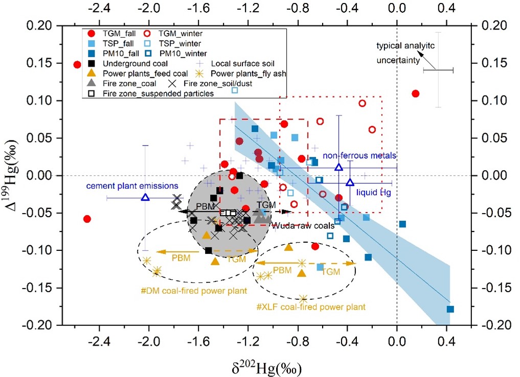 我院同位素前沿科学研究中心孙若愚教授课题组2018年评估了乌达煤火区及周围城区的大气汞浓度,发现其相比前些年显著降低,但依然显著高于背景值(Shan et al., 2019)。长期的煤火汞排放业已造成周围土壤汞浓度的显著升高(Cao et al., 2021)。乌达区是典型的工业城区,近些年在燃煤发电、化工、金属冶炼等领域迅速发展。定量评估新形势(煤火转入地下、工业产能增加)下乌达城区大气汞的来源对当地的环境管理具有重要的参考价值。
