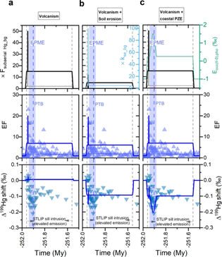 图1:不同环境改变情景下(a:大型火山;b:大型火山+陆地输入;c:大型火山+PZE)模拟的浅海沉积物(以金钉子煤山剖面为例)的汞富集系数(EF)和MIF的偏移值(Δ199Hg)