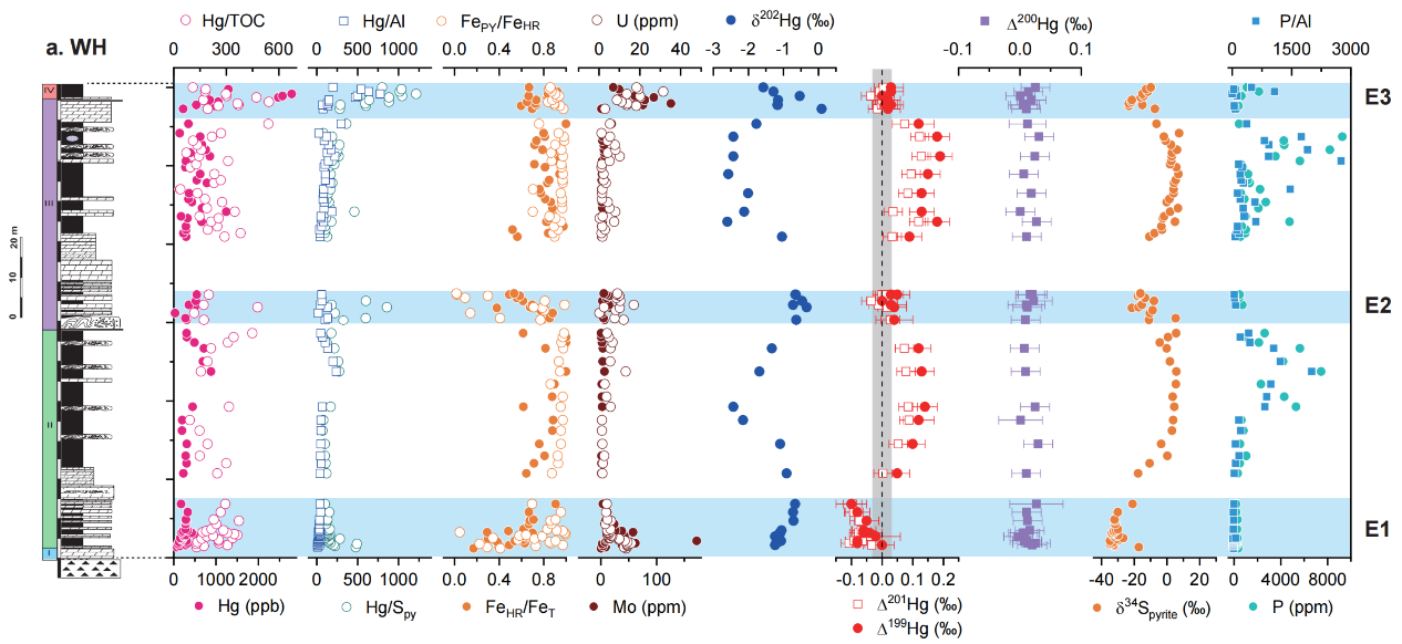 图2. 华南陡山沱组五河剖面的汞浓度、汞同位素以及其它地球化学指标。汞同位素的三次漂移(E1、E2和E3)指示反复的PZE。
