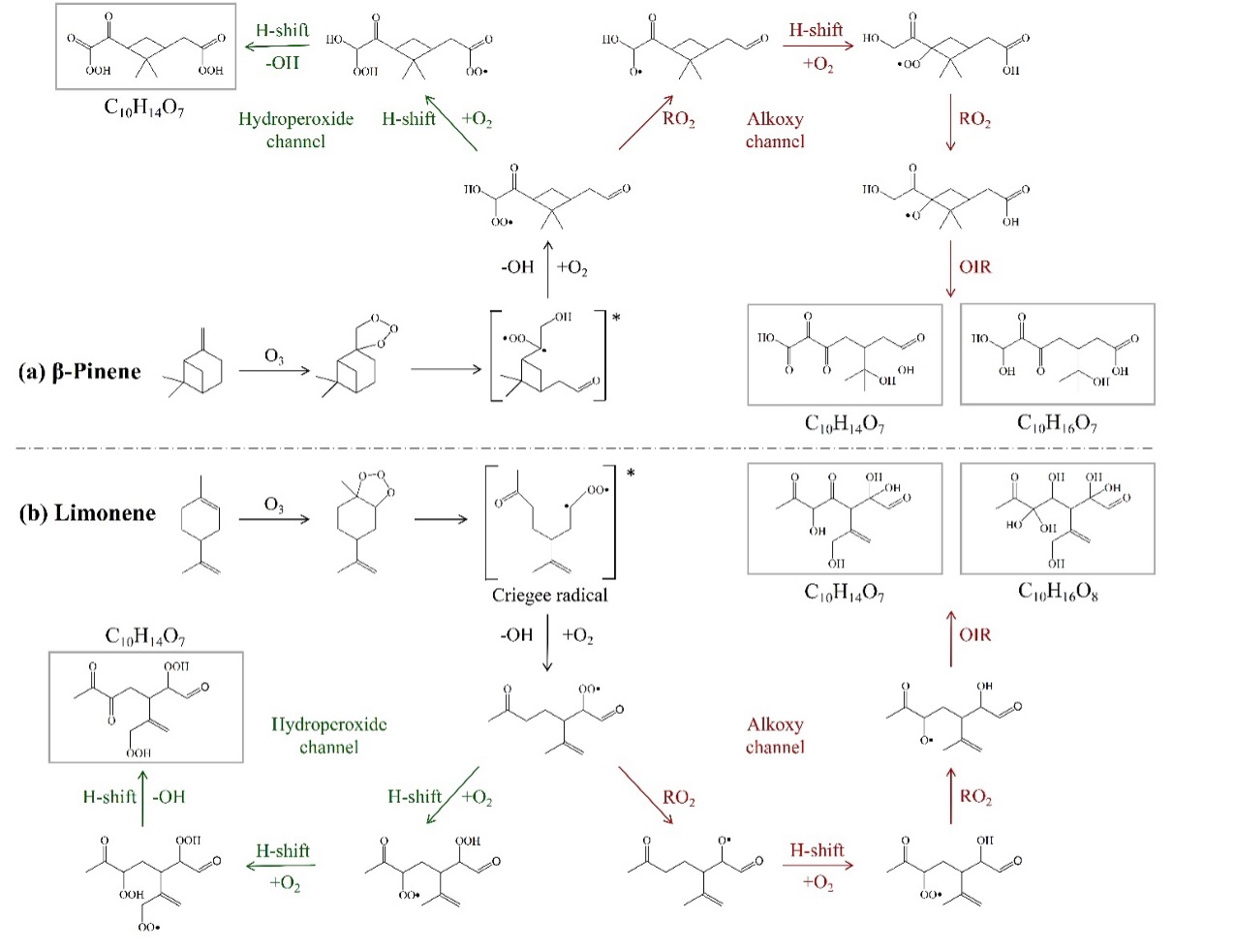 研究发现,柠檬烯SOA中HOMs的相对丰度为14-20%,高于β-蒎烯SOA中HOMs的相对丰度(3-13%),并随着臭氧浓度的增加呈现出不同的变化趋势。在臭氧浓度较高时,β-蒎烯氧化生成的HOMs产率较高,同时会生成大量超低挥发性有机物(ULVOC)。在中等臭氧浓度下,柠檬烯氧化生成的HOMs产量更高,其中半挥发性、低挥发性和极低挥发性有机化合物(SVOC、LOVC和ELVOC)发挥了主要作用(图1)。综合实验证据和理论分析表明,基于氧增加的过氧自由基化学反应是生成C10含氧有机化合物的合理机制(图2)。