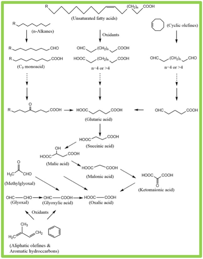 近日,天津大学地球系统科学学院Chandra Mouli Pavuluri教授课题组通过分析煤火区大气气溶胶中无机离子、二元酸及其相关化合物的分子分布和有机单体碳同位素等,发现草酸含量最高,平均占总二元酸的50.8%;含量第二高是邻苯二甲酸(avg. 13.7%)。壬二酸是含量第三高的二元酸(avg. 7.4%),其次是丁二酸和丙二酸。经过统计分析和有机单体的δ13C值表明二元酸及其相关化合物主要来自地下煤火以及原位的二次形成。其中,壬二酸(C9二元酸)的主要前体物来自于地下煤火排放的不饱和脂肪酸的原位光化学氧化(图1)。