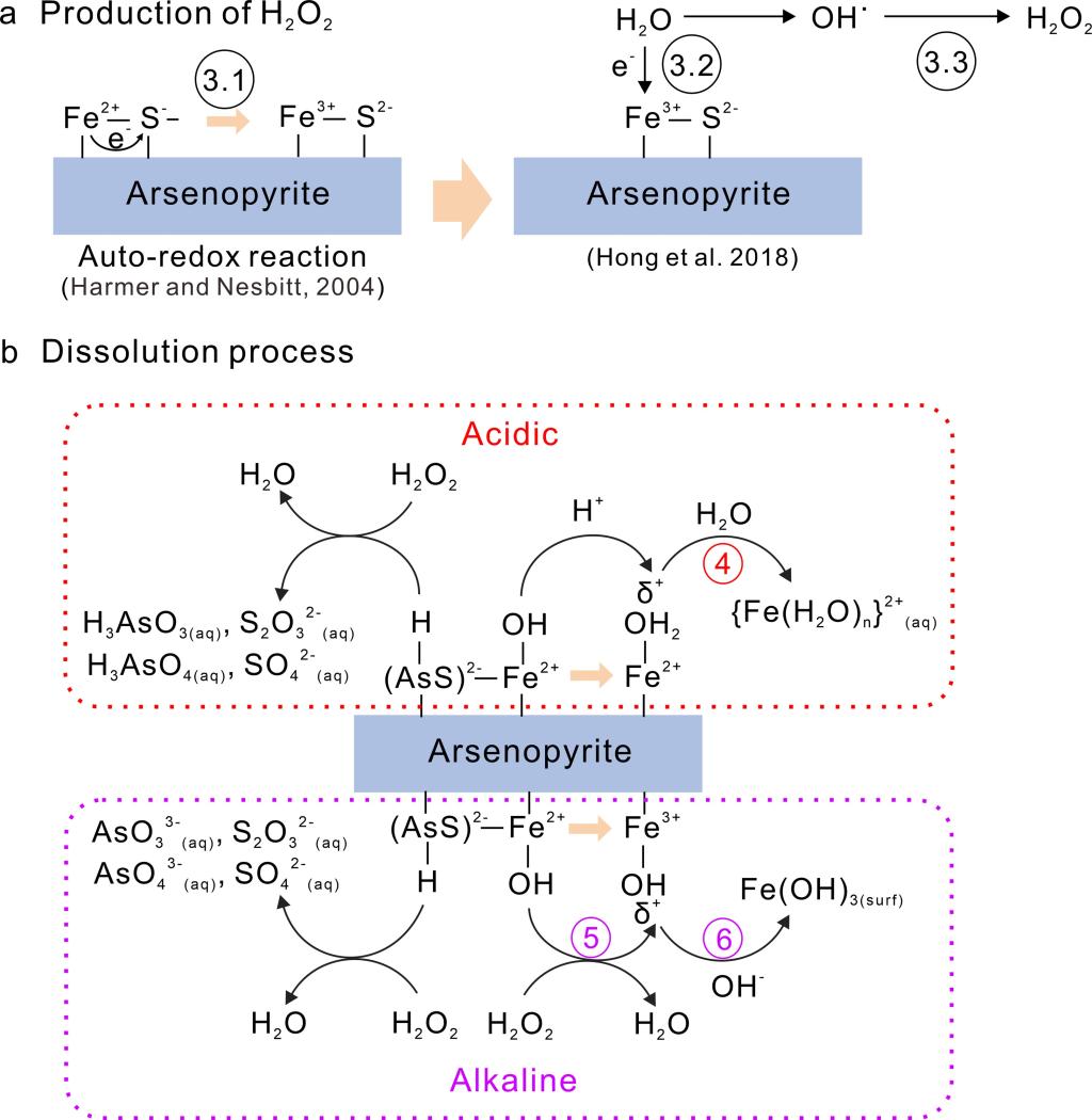 (4) 基于毒砂表面的自发氧化还原反应以及表面络合模型,我们提出了毒砂在不同pH条件下的无氧溶解机制(图3b)。