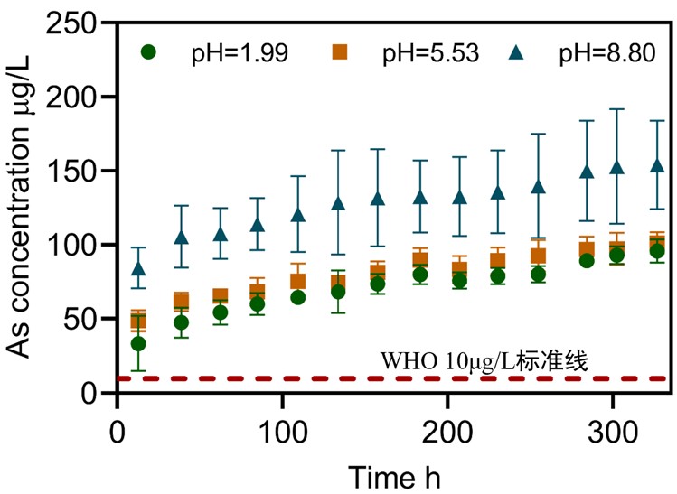 (1) 在无氧条件下,毒砂溶解10 h即可产生高砷污染水(>10 μg/L WHO标准)(图1)。