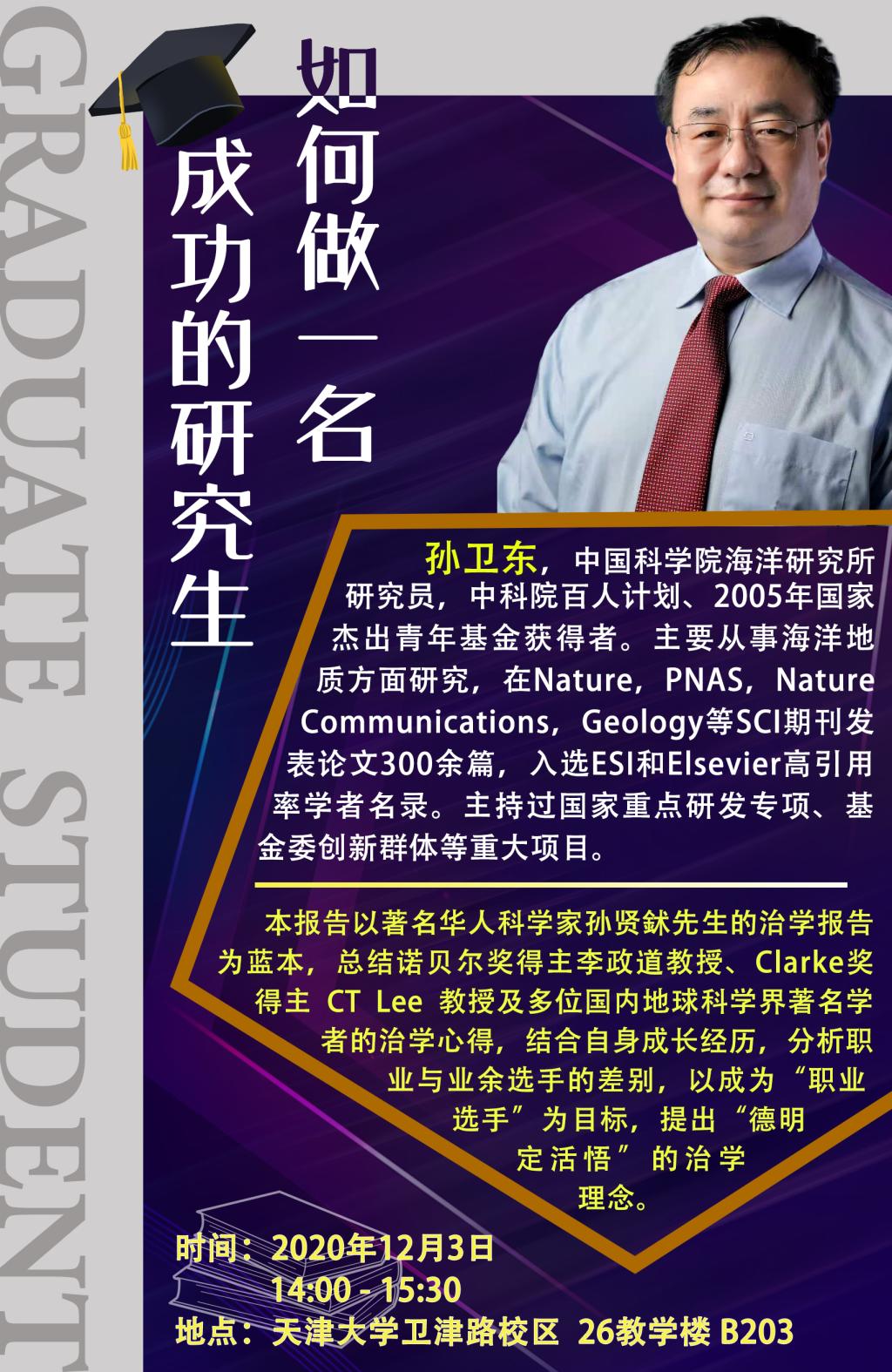 报告简介:对于从事科学研究的人来讲,研究生是一个重要的成长环节。对于立志科研的同学,能否做一名成功的研究生关系到今后科研的道路是否顺利、能否取得重要的成果。本报告以著名华人科学家孙贤鉥先生的治学报告为蓝本,总结诺贝尔奖得主李政道教授、Clarke奖得主CT Lee教授及多位国内地球科学界著名学者的治学心得,结合报告人自己的成长经历,分析职业选手与业余选手的差别,以成为“职业选手“为目标,提出 “德明定活悟“的治学理念。