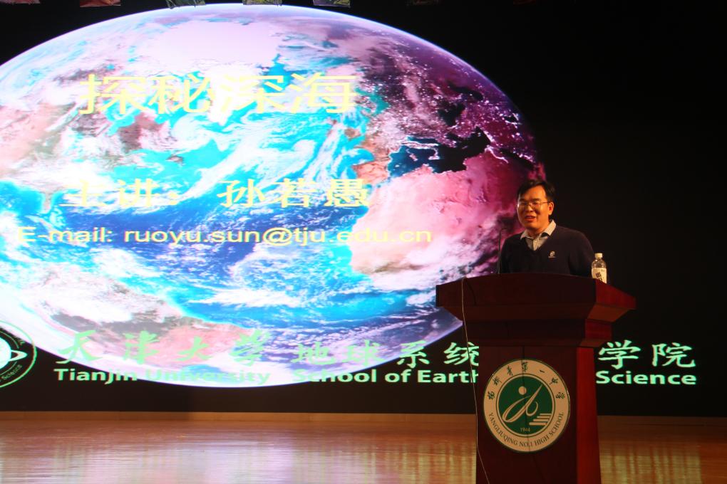 科普团组成员孙若愚教授为高一同学做了题目为《探秘深海》的科普讲座。他图文并茂地讲述了“深地-深海-深空”是我们人类21世纪以来新的探索方向,向同学们阐述了我们为什么要探索海洋,如何探索海洋,把海洋探测发展的过去、现状、未来以及人类的探测手段和天津大学在海洋探测领域所做出的贡献向同学们一一道来。随后,李晓东副院长介绍了地球系统科学学院以及地理科学专业的发展历史和取得的成就并从“地球系统地理学”的角度对在场学生进行了职业规划和专业指导。