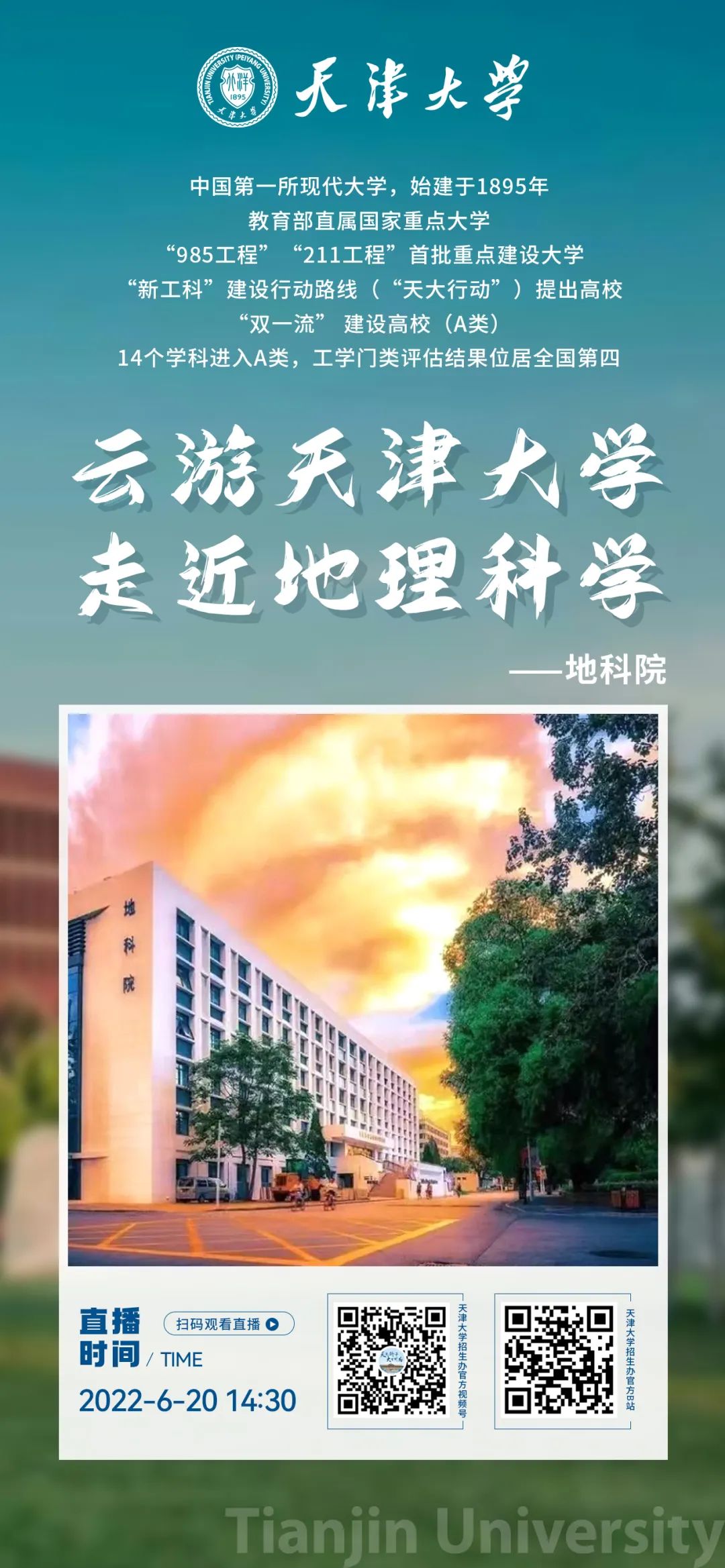为促进广大考生和家长对天津大学及地理科学专业的了解,2022年6月20日,地科院举办主题为“云游天津大学,走近地理科学”的本科招生宣传网络直播活动,活动通过天津大学招生办官方视频号和官方B站直播。