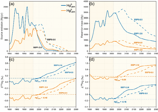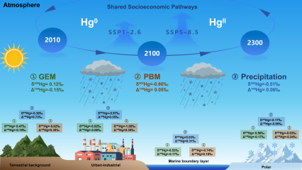 One of the core innovations of this research is the coupling of atmospheric Hg isotope simulations with future climate change scenarios (Figure 2). The study updates a one-dimensional atmospheric-land-ocean Hg isotope model based on Shared Socioeconomic Pathways (SSPs) to evaluate the long-term evolution of atmospheric Hg isotopes under different SSP scenarios. The results show that under a low-emission scenario characterized by green transformation (SSP1–2.6), the values of atmospheric Hg MDF (δ202Hg) and odd-MIF (Δ199Hg) exhibit a more significant upward trend over time compared to high-emission scenarios (SSP5–8.5). This evolution suggests a fundamental shift in the mechanisms driving the future atmospheric Hg cycle. As direct anthropogenic emissions (MIF≈0‰) decrease, legacy Hg (re-released from soils and oceans) with strong isotopic signals will increasingly dominate the atmospheric Hg budget, shaping the future trajectory of Hg isotopes in the atmosphere.
