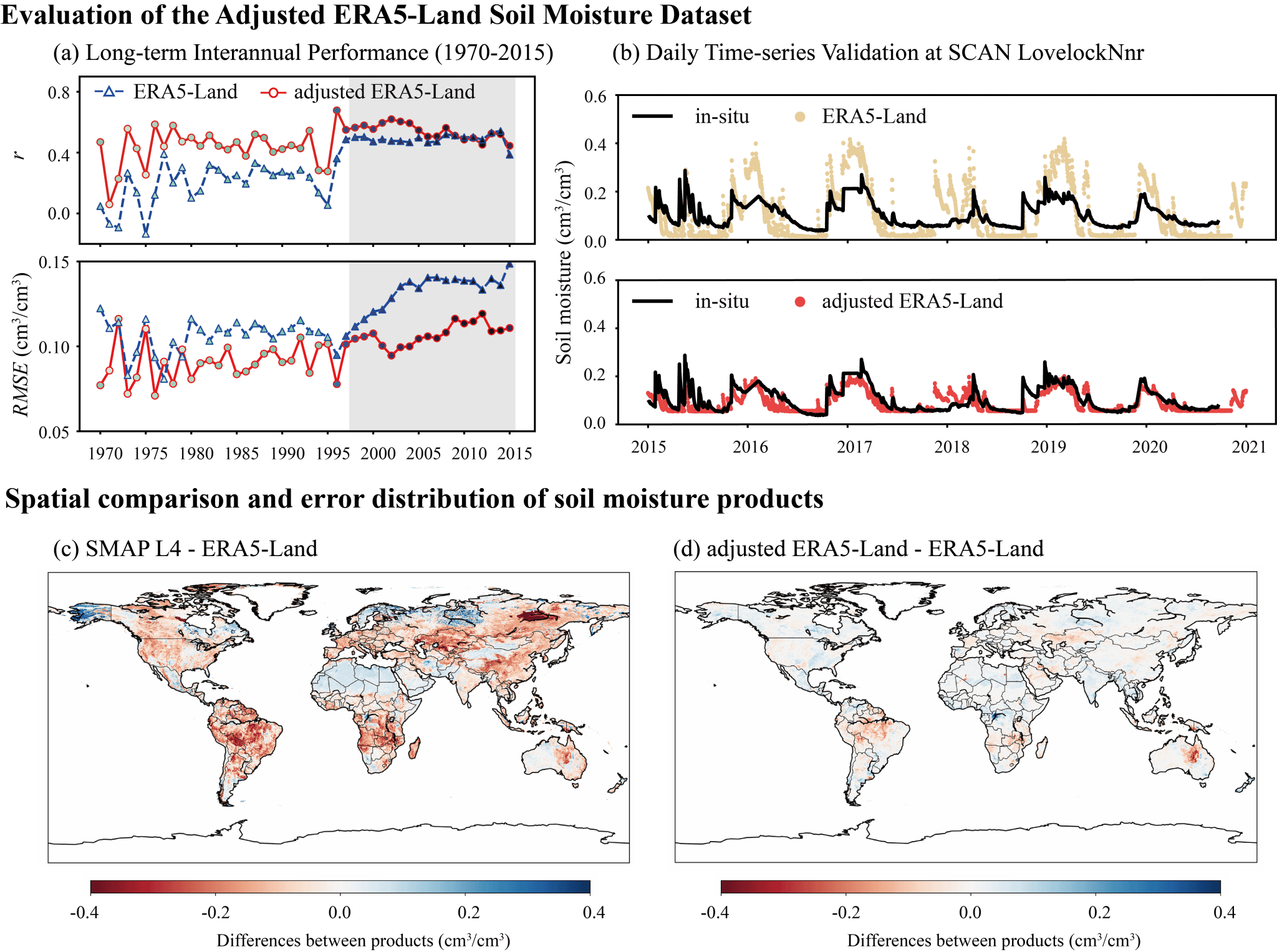 Recently, the research group led by Associate Professor Yonggen Zhang at the School of Earth System Science, Tianjin University, published a study in the Top journal Earth System Science Data entitled “Fusing ERA5-Land and SMAP L4 for an Improved Global Soil Moisture Product (1950-2025)”. In this study, the team developed an Global Daily Soil Moisture Dataset at 0.1° Resolution (Adjusted ERA5-Land) soil moisture dataset spanning 1950 to 2025 by fusing ERA5-Land and SMAP L4. The resulting dataset substantially improves spatiotemporal coverage while effectively reducing systematic bias.