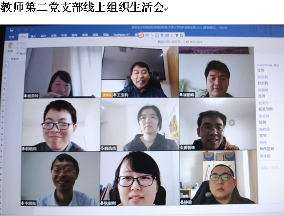 学院三个教工党支部、两个学生党支部、一个师生混合党支部疫情期间均多次召开线上组织生活。探讨疫情期间党员如何发挥先锋作用,复工复学防控措施等,学习《习近平总书记关于疫情防控工作的重要讲话》、《教育部致全国大学生的一封信》等。学生党支部利用线上答辩等形式发展积极分子4名,发展对象4名。开展线上院级积极分子分党校与发展对象培训,有序推进党建各项工作。