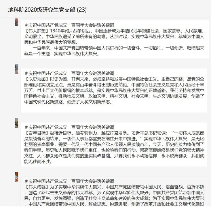 7月1日庆祝中国共产党成立一百周年大会上习近平总书记发表重要讲话,支部党员自发观看,同时支部交流平台内积极开展“庆祝中国共产党成立一百周年大会关键词接力”,共同感悟总书记的讲话精神,促学促研促领悟。