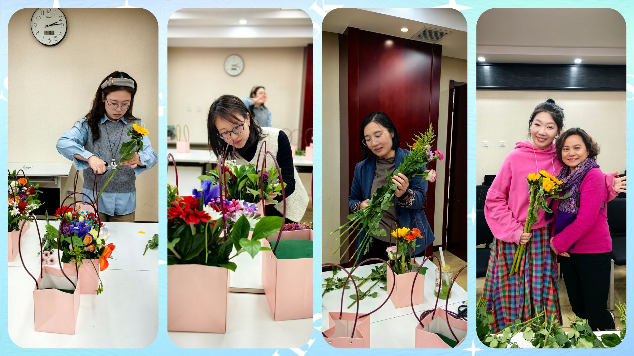 活动现场花香馥郁、笑语盈盈,洋溢着温馨而热烈的节日氛围。在花艺师的指导下,老师们兴致盎然地投入到花艺创作中,将玫瑰的浪漫、洋甘菊的清新、康乃馨的温婉巧妙融合,编织成一个个独具匠心、层次丰富的花艺提篮。多肉盆景制作环节同样精彩纷呈,大家充分发挥想象力,将形态各异的多肉植株与苔藓、铺面石巧妙搭配,打造出妙趣横生、生机盎然的“微缩花园”。活动不仅呈现了地科院“她力量”对美的敏锐感知与创造力,更展示了她们对生活的无限热爱与美好期许。