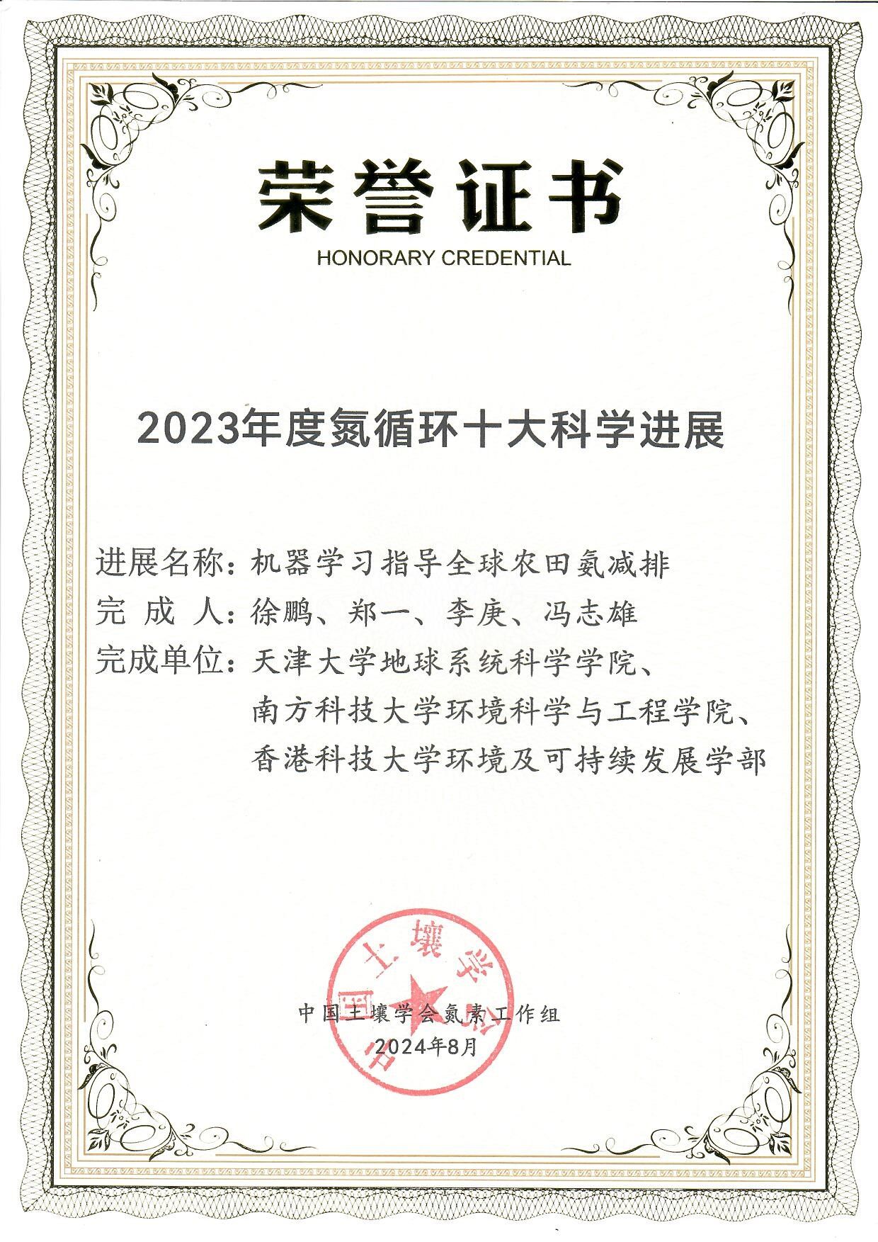 2024年8月17日,第五届氮素生物地球化学循环学术论坛在湖北武汉成功召开,论坛同时发布了2023年度“氮循环十大科学进展”。天津大学地科院徐鹏副教授联合合作者的研究成果“机器学习指导全球农田氨减排”入选,主要完成人包括徐鹏,郑一,李庚,冯志雄。