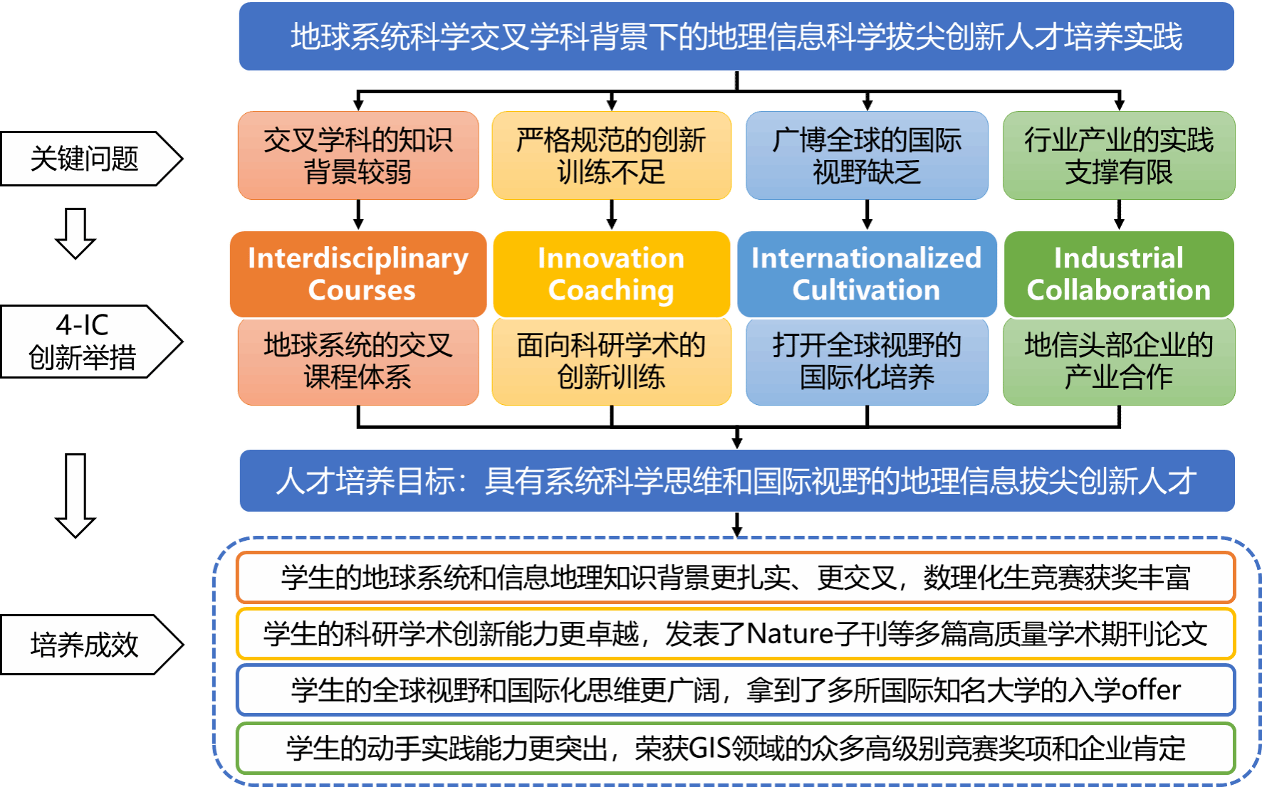 面对全球变化问题,围绕学科交叉发展趋势,地科院针对传统GIS教育多侧重技术、相对少强调多学科融合以及由此导致的学生交叉学科知识背景较弱、严格规范的创新训练不足、广博全球的国际视野缺乏、行业产业的实践支撑有限等问题,依托全国首个地球系统科学交叉学科平台,基于地理科学专业中的“数据与地理信息科学与技术”模块,在培养方案、课程体系、国际交流、创新引领、实践支撑等方面采取了系列创新举措,构建了“4-IC”创新培养体系: