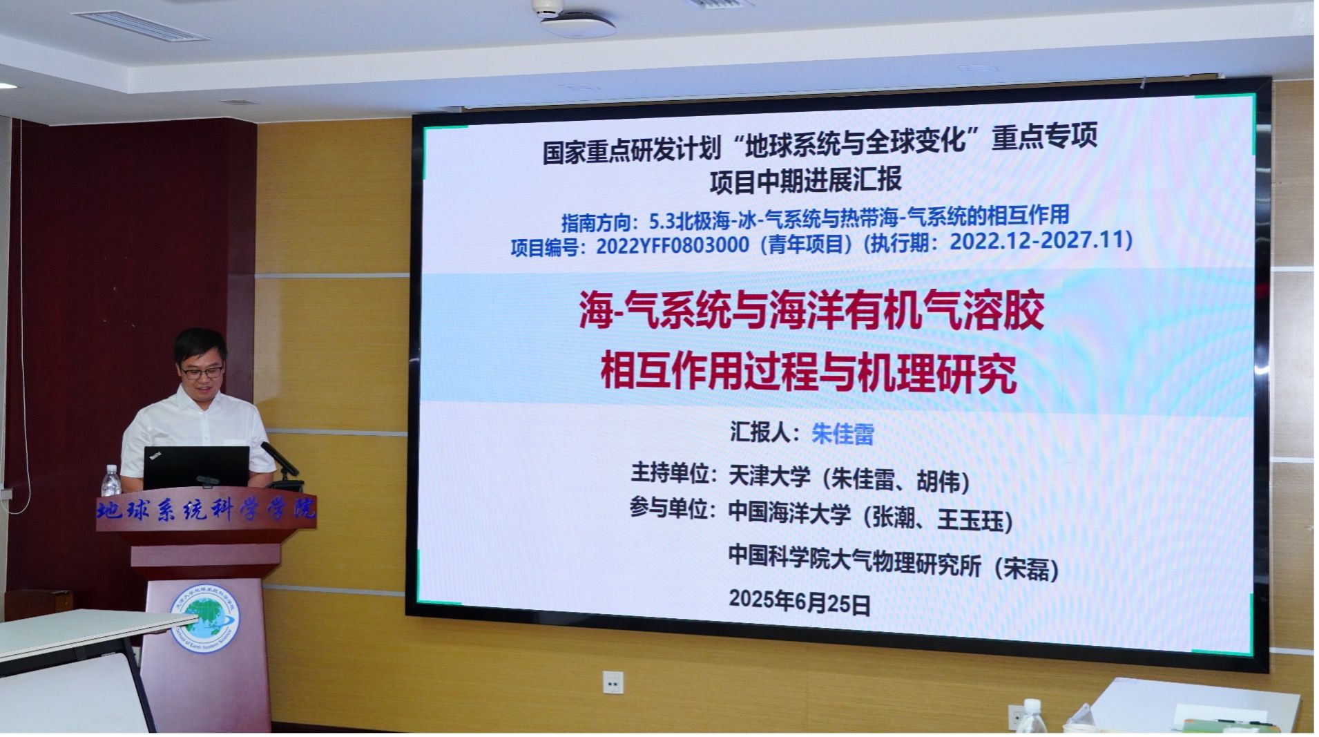 2025年6月25日,天津大学地球系统科学学院朱佳雷教授牵头,联合中国海洋大学、中国科学院大气物理研究所承担的国家重点研发计划青年科学家项目“海-气系统与海洋有机气溶胶相互作用过程与机理研究”中期进展汇报暨专家咨询会在天津大学卫津路校区召开。该项目面向地球系统科学及全球变化的前沿科学问题,重点开展地球系统中海洋有机气溶胶理化性质和气候生态效应的观测分析和数值模拟研究,为降低全球气候变化模拟和预测不确定性提供科学支撑。
