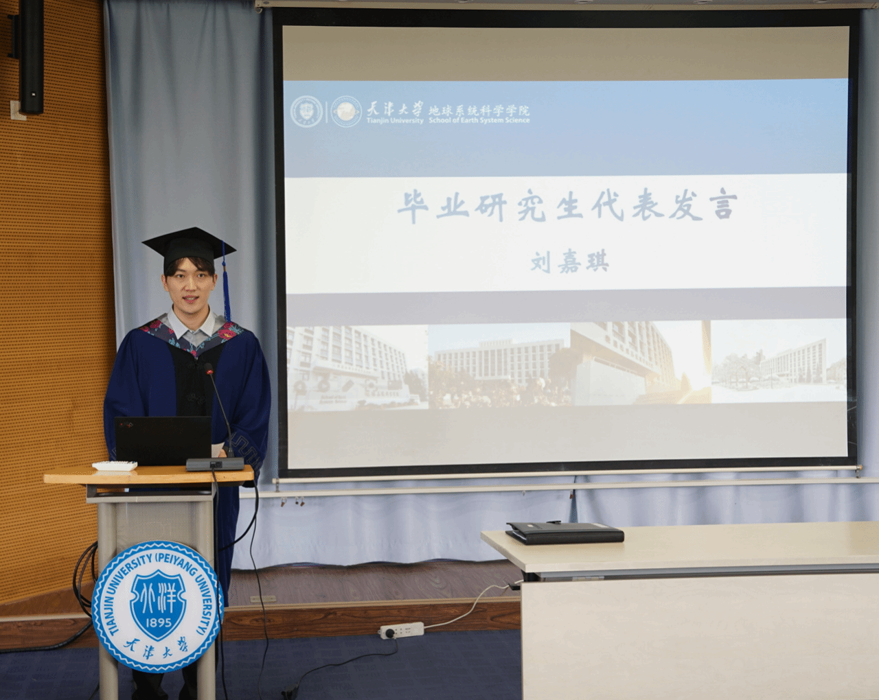 硕士毕业生代表刘嘉琪回望地科三年的求学时光:严谨专业的千锤百炼赋予他底气、携手奋斗的日月星辰给予他回忆、心系家国的使命担当赐予他光芒。他饱含真情地将毕业生比作一棵棵海棠,每个人都在学院的沃土上不断追寻智慧、锤炼思想、锻炼意志,完成了自己独特的生长与绽放。