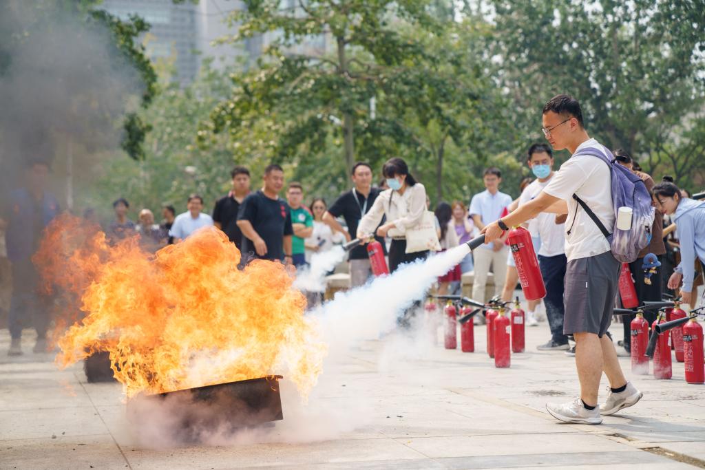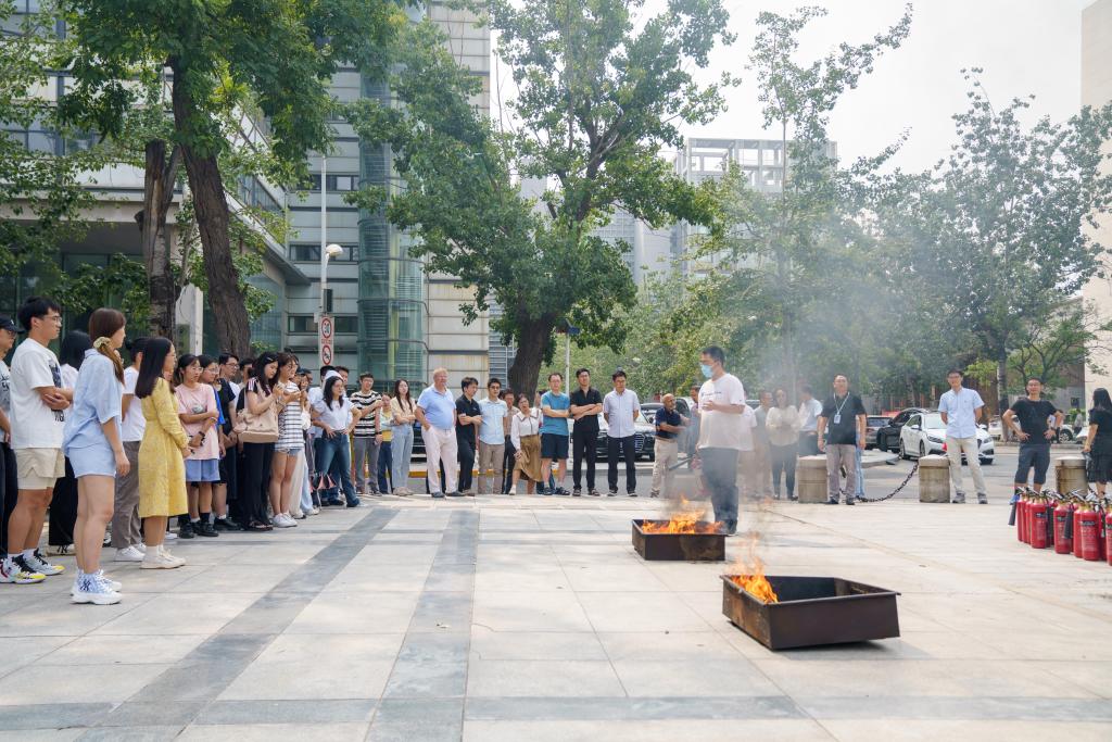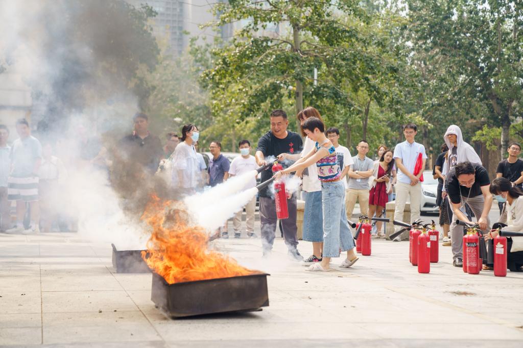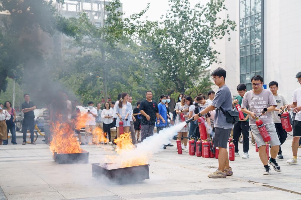 保卫处防火科老师为全体师生进行了灭火器材的使用培训,以二氧化碳灭火器为例,详细讲解了灭火器的使用操作程序,实地演示灭火器的使用,强调灭火要点和前提。随后,多名师生参与灭火实操演练。