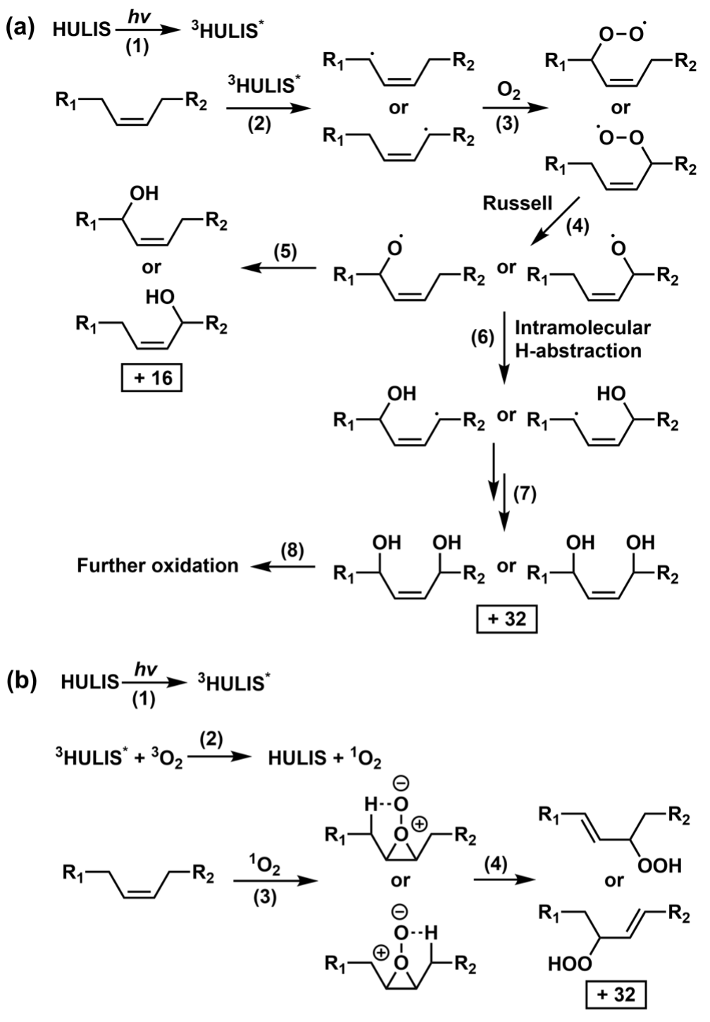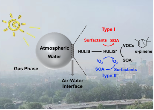 图1. 气-液界面类腐殖质(HULIS)诱导底物的I型和II型光敏氧化机制