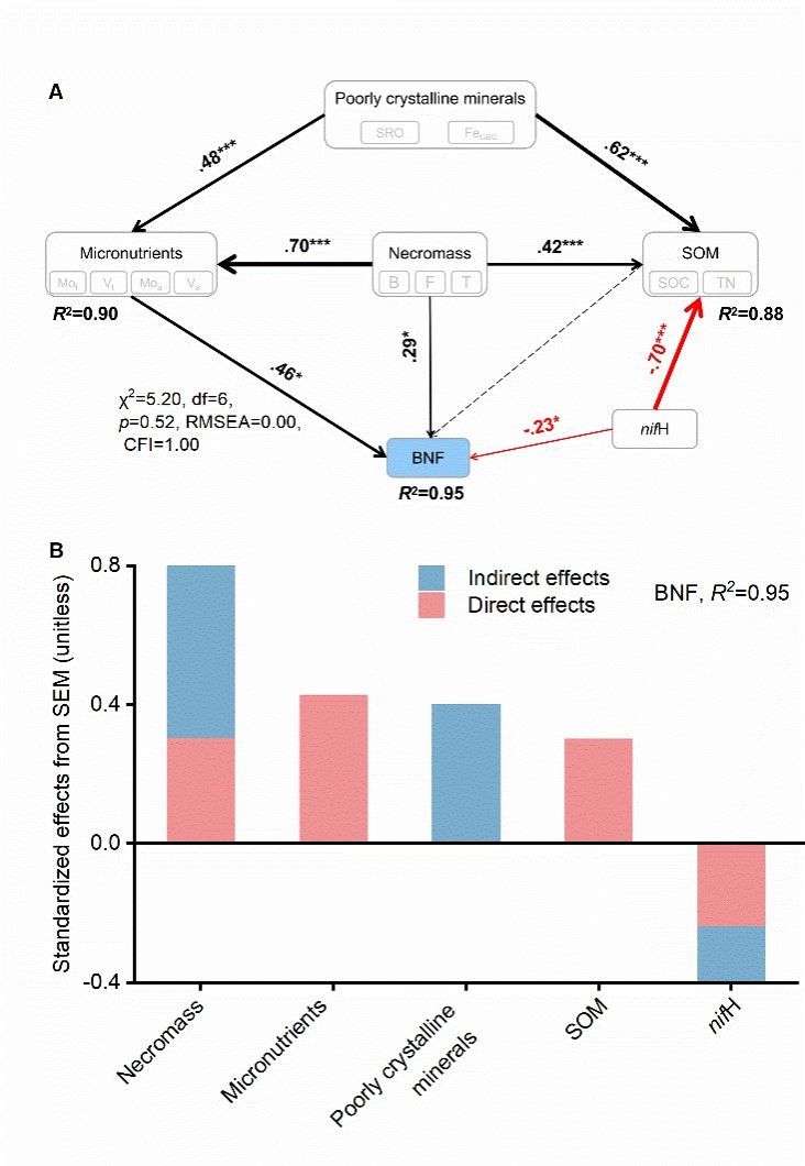 结构方程模型(SEM)表明,微量元素和微生物残体在固氮属中的关键作用顺序为:微生物残体 > 微量元素 = 弱晶型矿物 > 土壤有机质(图2)。因此,水稻土中的固氮菌主要受到微生物残体控制,揭示了微生物残体在微量元素截留中发挥了重要作用。