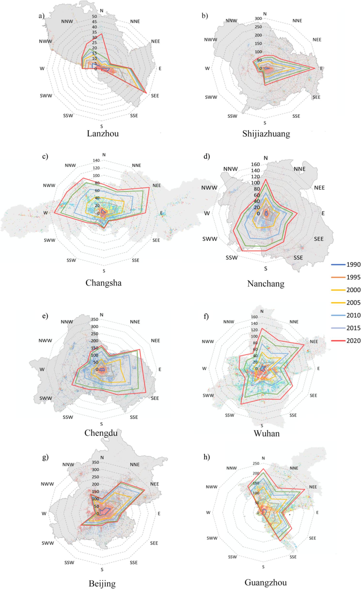 图2. 典型城市空间扩张雷达图。(雷达图中心位于1985年城市不透水面中心。a和b表示轴状;c和d表示椭圆状;e和f表示圆状;g和h表示扇状)